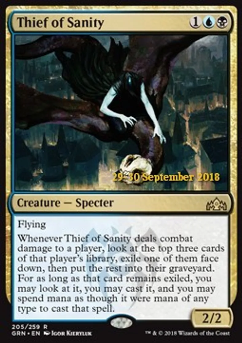 | Oracle Text | Flying Whenever Thief of Sanity deals combat damage to a player, look at the top three cards of that player's library, exile one of them face down, then put the rest into their graveyard. For as long as that card remains exiled, you may look at it, you may cast it, and you may spend mana as though it were mana of any type to cast that spell. | ||