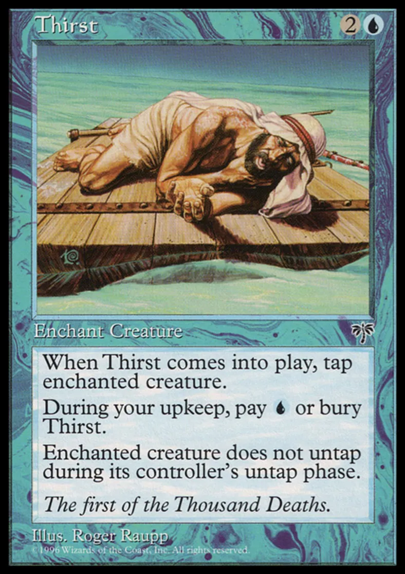 | Oracle Text | Enchant creature When Thirst enters the battlefield, tap enchanted creature. Enchanted creature doesn't untap during its controller's untap step. At the beginning of your upkeep, sacrifice Thirst unless you pay {{u}}. | ||