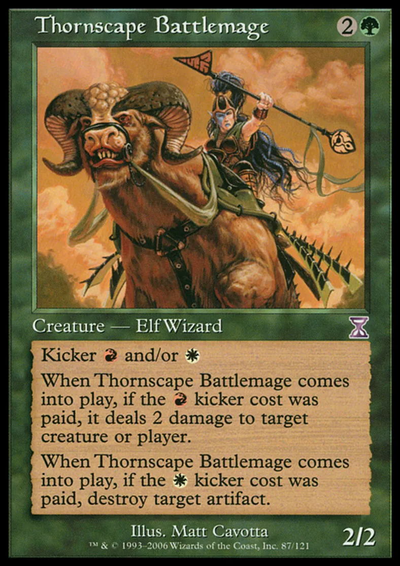 | Oracle Text | Kicker {{r}} and/or {{w}} (You may pay an additional {{r}} and/or {{w}} as you cast this spell.) When Thornscape Battlemage enters the battlefield, if it was kicked with its {{r}} kicker, it deals 2 damage to target creature or player. When Thornscape Battlemage enters the battlefield, if it was kicked with its {{w}} kicker, destroy target artifact. | ||