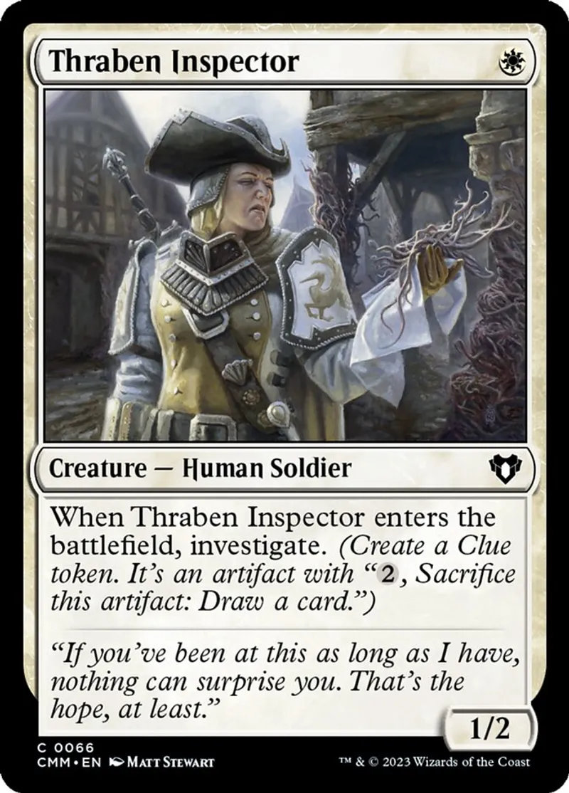 | Oracle Text | When Thraben Inspector enters the battlefield, investigate. (Create a Clue token. It's an artifact with "{2}, Sacrifice this artifact: Draw a card.") | ||