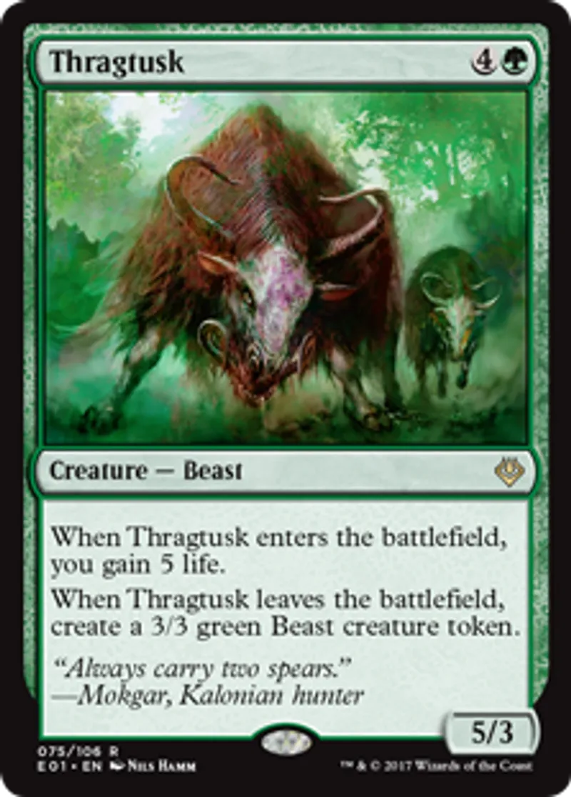 | Oracle Text | When Thragtusk enters the battlefield, you gain 5 life. When Thragtusk leaves the battlefield, create a 3/3 green Beast creature token. | ||