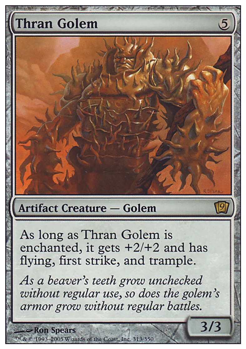| Oracle Text | As long as Thran Golem is enchanted, it gets +2/+2 and has flying, first strike, and trample. | ||