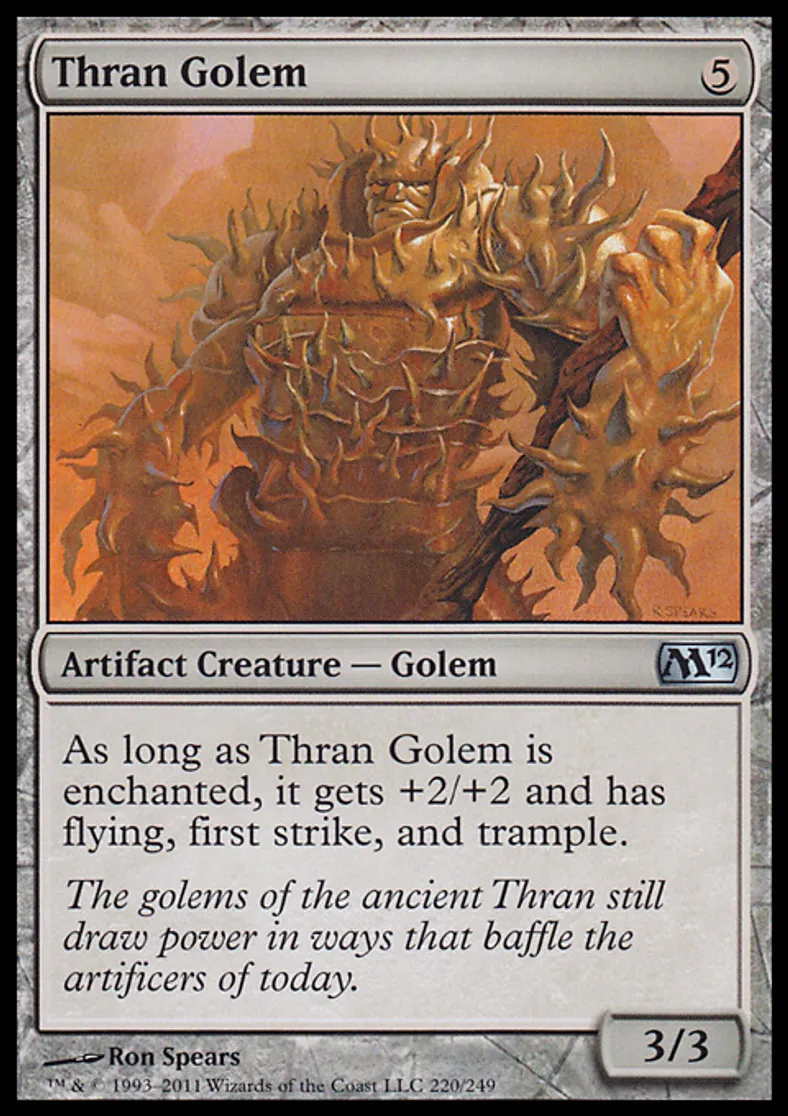 | Oracle Text | As long as Thran Golem is enchanted, it gets +2/+2 and has flying, first strike, and trample. | ||