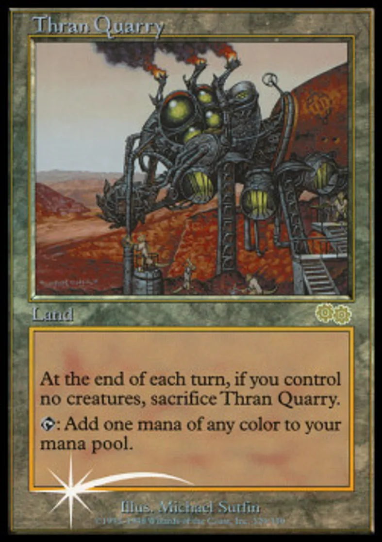 | Oracle Text | At end of turn, if you control no creatures, sacrifice Thran Quarry. {{T}}: Add one mana of any color to your mana pool. | ||