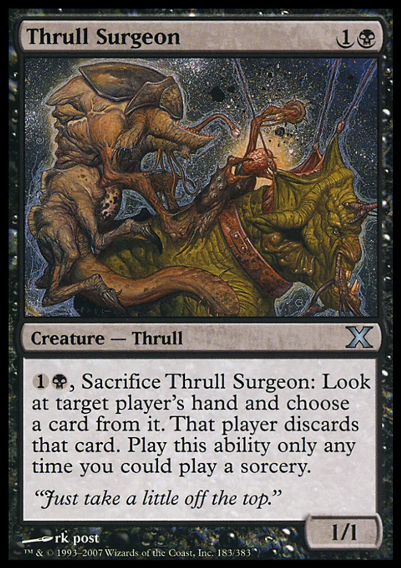 | Oracle Text | {{1}}{{b}}, Sacrifice Thrull Surgeon: Look at target player's hand and choose a card from it. That player discards that card. Activate this ability only any time you could cast a sorcery. | ||