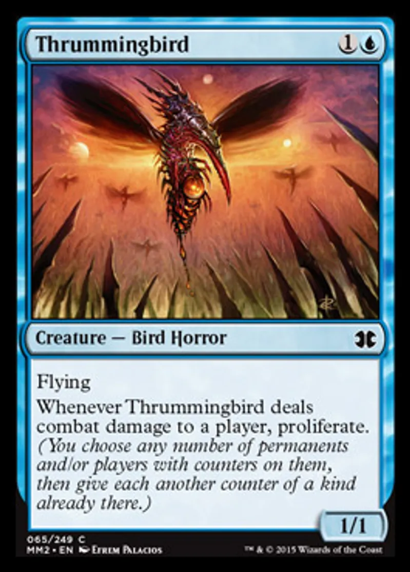 | Oracle Text | Flying Whenever Thrummingbird deals combat damage to a player, proliferate. (You choose any number of permanents and/or players with counters on them, then give each another counter of a kind already there.) | ||