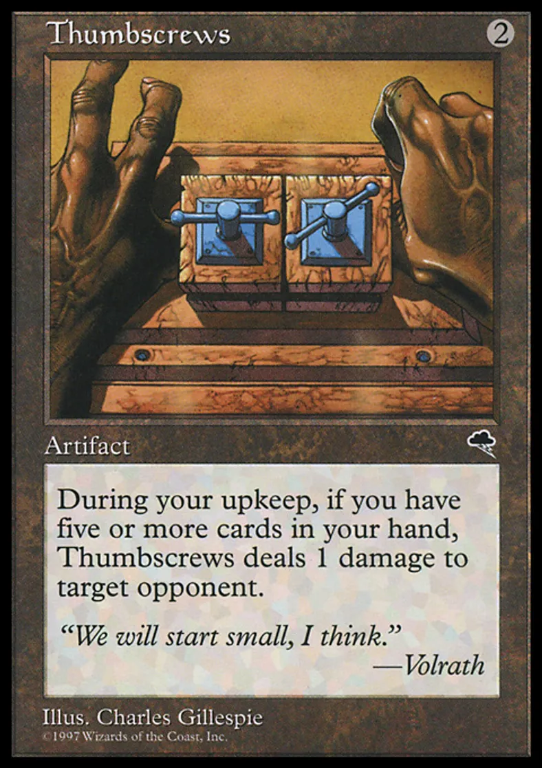 | Oracle Text | At the beginning of your upkeep, if you have five or more cards in hand, Thumbscrews deals 1 damage to target opponent. | ||