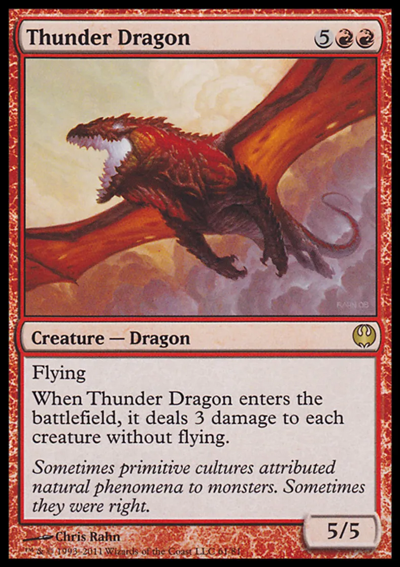 | Oracle Text | Flying When Thunder Dragon enters the battlefield, it deals 3 damage to each creature without flying. | ||