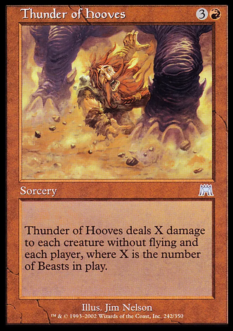 | Oracle Text | Thunder of Hooves deals X damage to each creature without flying and each player, where X is the number of Beasts on the battlefield. | ||