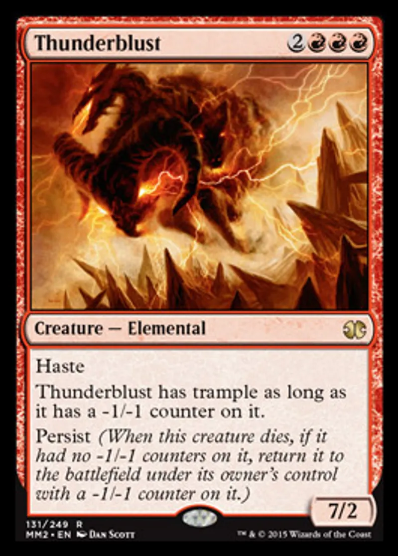 | Oracle Text | Haste Thunderblust has trample as long as it has a -1/-1 counter on it. Persist (When this creature dies, if it had no -1/-1 counters on it, return it to the battlefield under its owner's control with a -1/-1 counter on it.) | ||