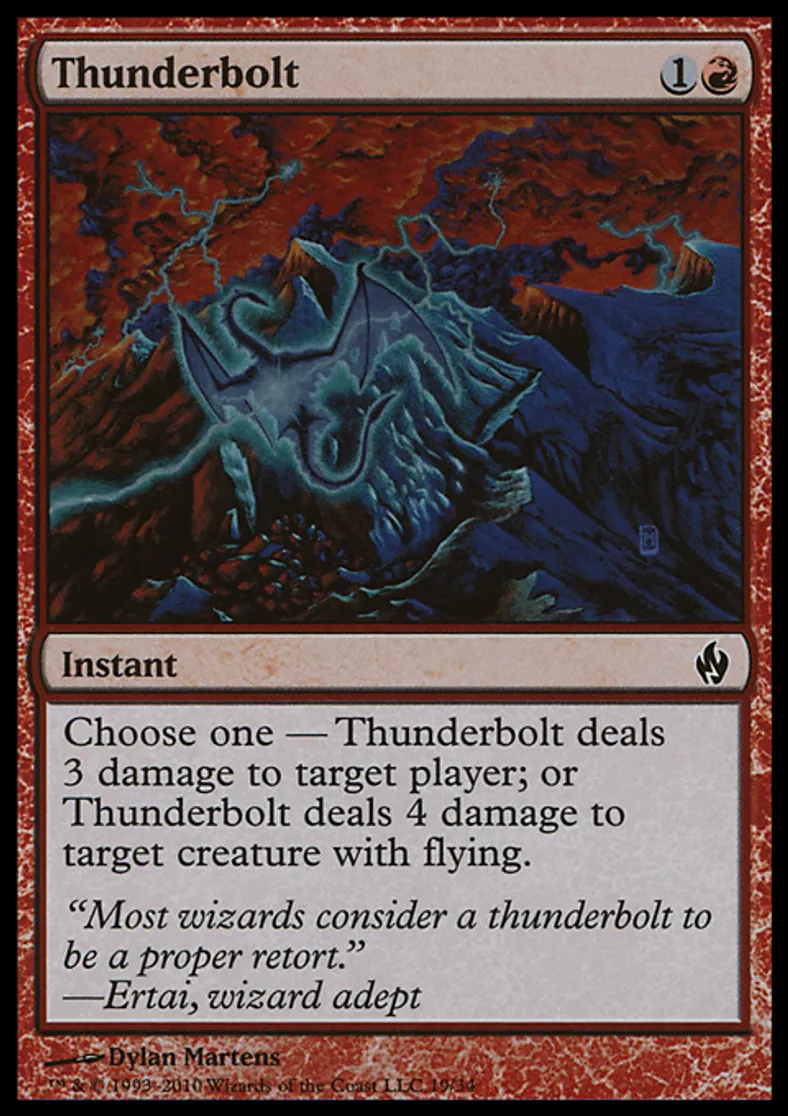 | Oracle Text | Choose one — Thunderbolt deals 3 damage to target player; or Thunderbolt deals 4 damage to target creature with flying. | ||