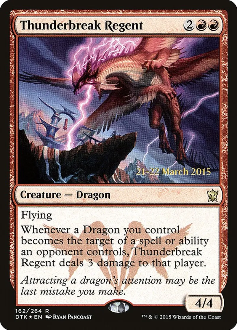 Whenever a Dragon you control becomes the target of a spell or ability an opponent controls, Thunderbreak Regent deals 3 damage to that player. | ||