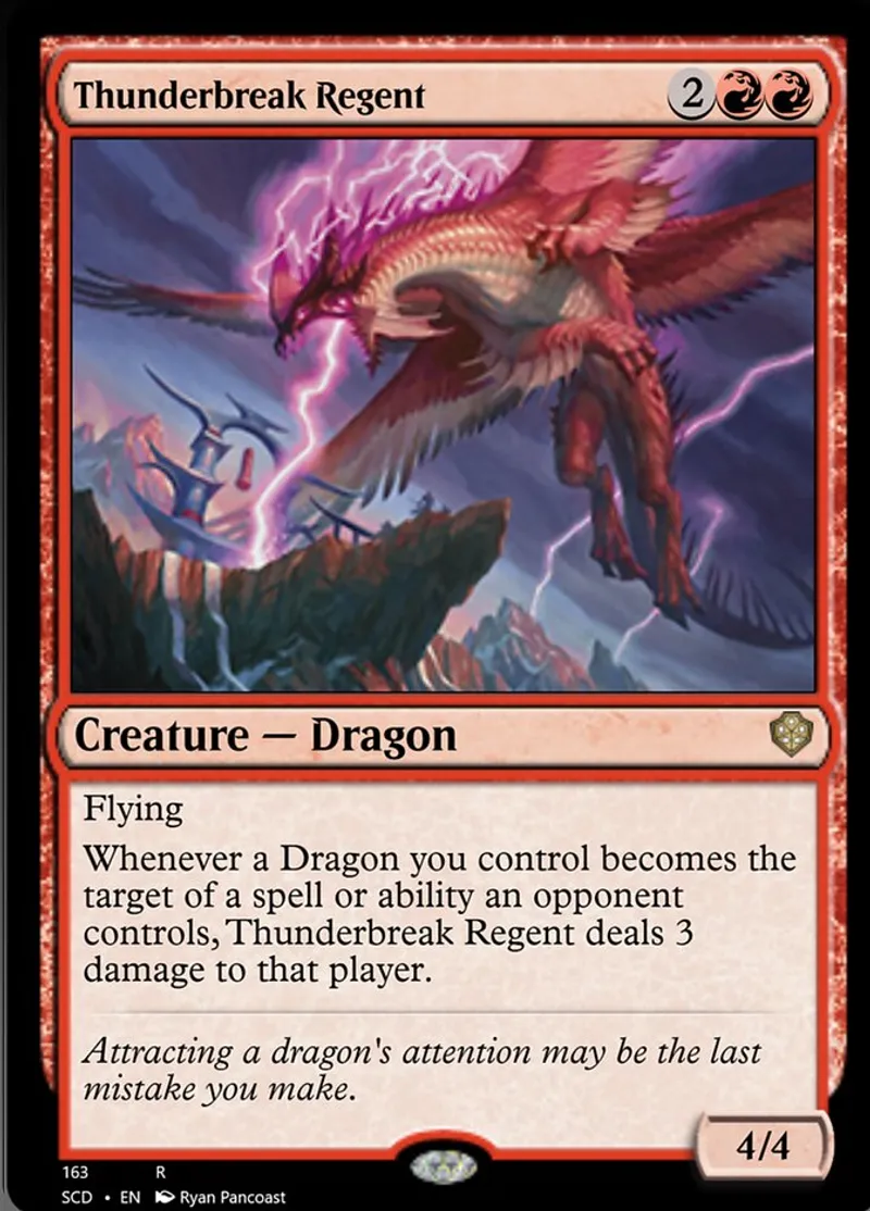 Whenever a Dragon you control becomes the target of a spell or ability an opponent controls, Thunderbreak Regent deals 3 damage to that player. | ||