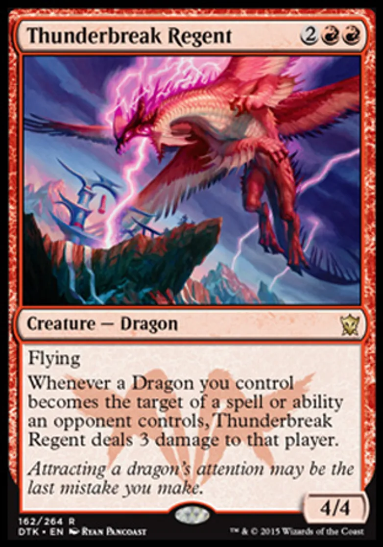 | Oracle Text | Flying Whenever a Dragon you control becomes the target of a spell or ability an opponent controls, Thunderbreak Regent deals 3 damage to that player. | ||