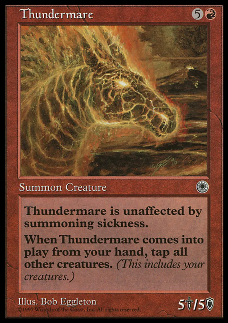 | Oracle Text | Haste (This creature can attack the turn it comes under your control.) When Thundermare enters the battlefield, tap all other creatures. | ||