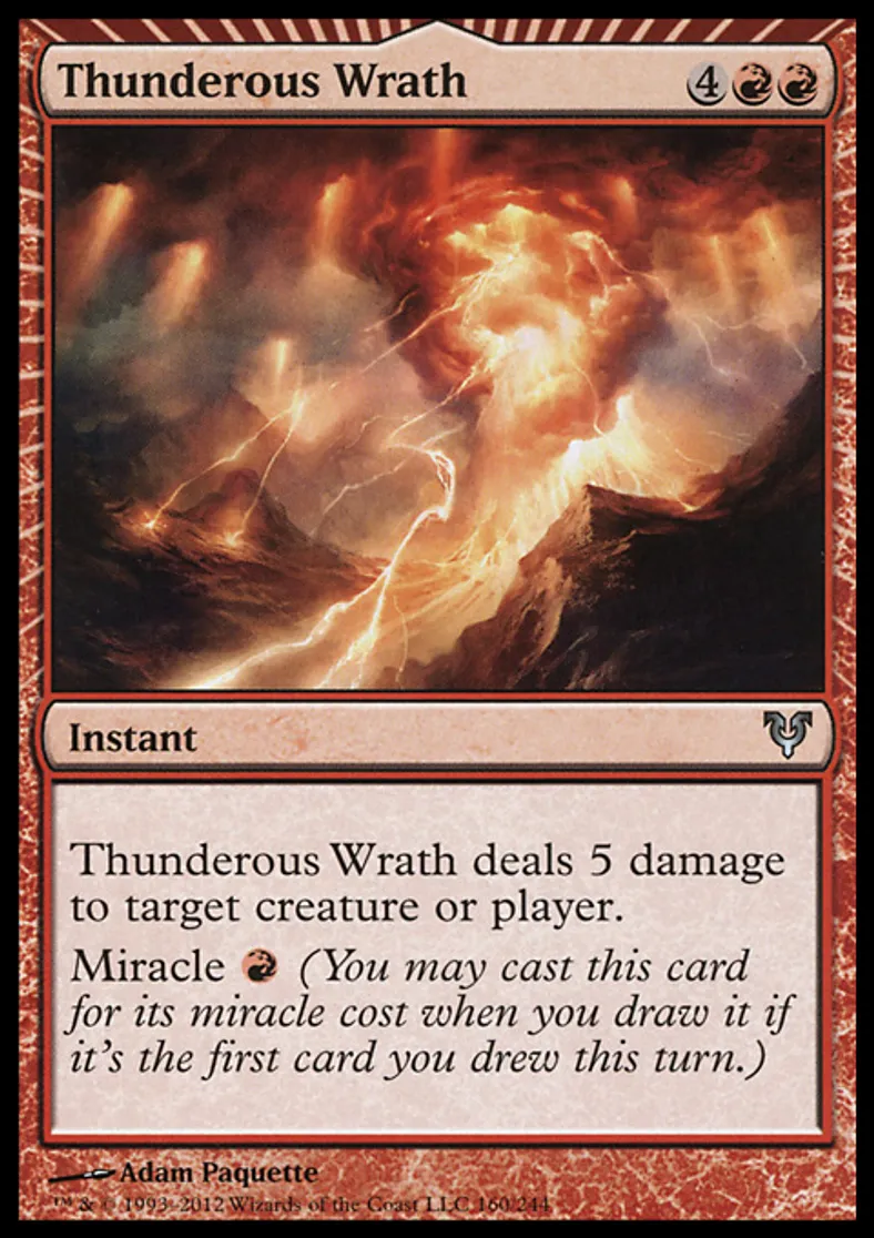 | Oracle Text | Thunderous Wrath deals 5 damage to target creature or player. Miracle {{r}} (You may cast this card for its miracle cost when you draw it if it's the first card you drew this turn.) | ||