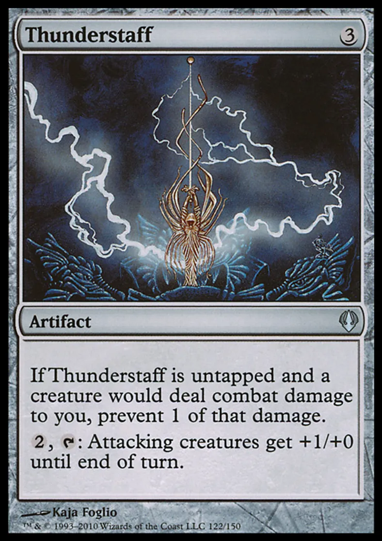 | Oracle Text | As long as Thunderstaff is untapped, if a creature would deal combat damage to you, prevent 1 of that damage. {{2}}, {{t}}: Attacking creatures get +1/+0 until end of turn. | ||