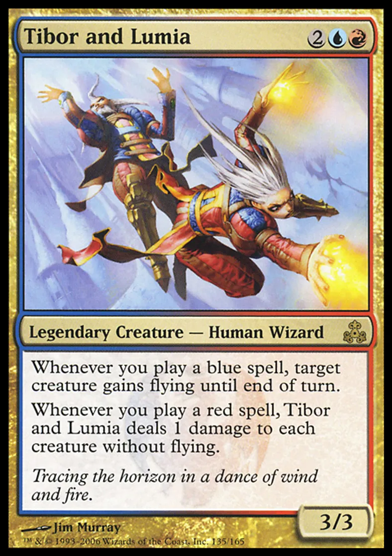 | Oracle Text | Whenever you cast a blue spell, target creature gains flying until end of turn. Whenever you cast a red spell, Tibor and Lumia deals 1 damage to each creature without flying. | ||