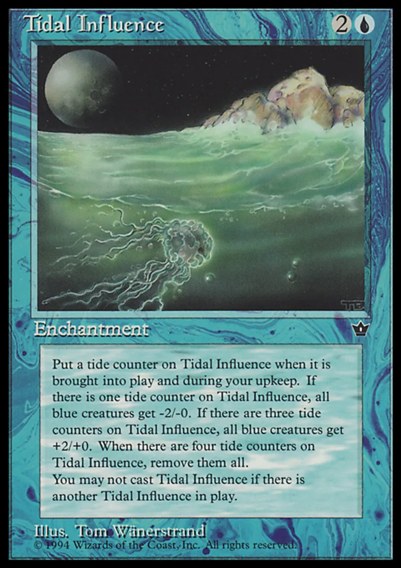 | Oracle Text | Cast Tidal Influence only if no permanents named Tidal Influence are on the battlefield. Tidal Influence enters the battlefield with a tide counter on it. At the beginning of your upkeep, put a tide counter on Tidal Influence. As long as there is exactly one tide counter on Tidal Influence, all blue creatures get -2/-0. As long as there are exactly three tide counters on Tidal Influence, all blue creatures get +2/+0. Whenever there are four tide counters on Tidal Influence, remove all tide counters from it. | ||