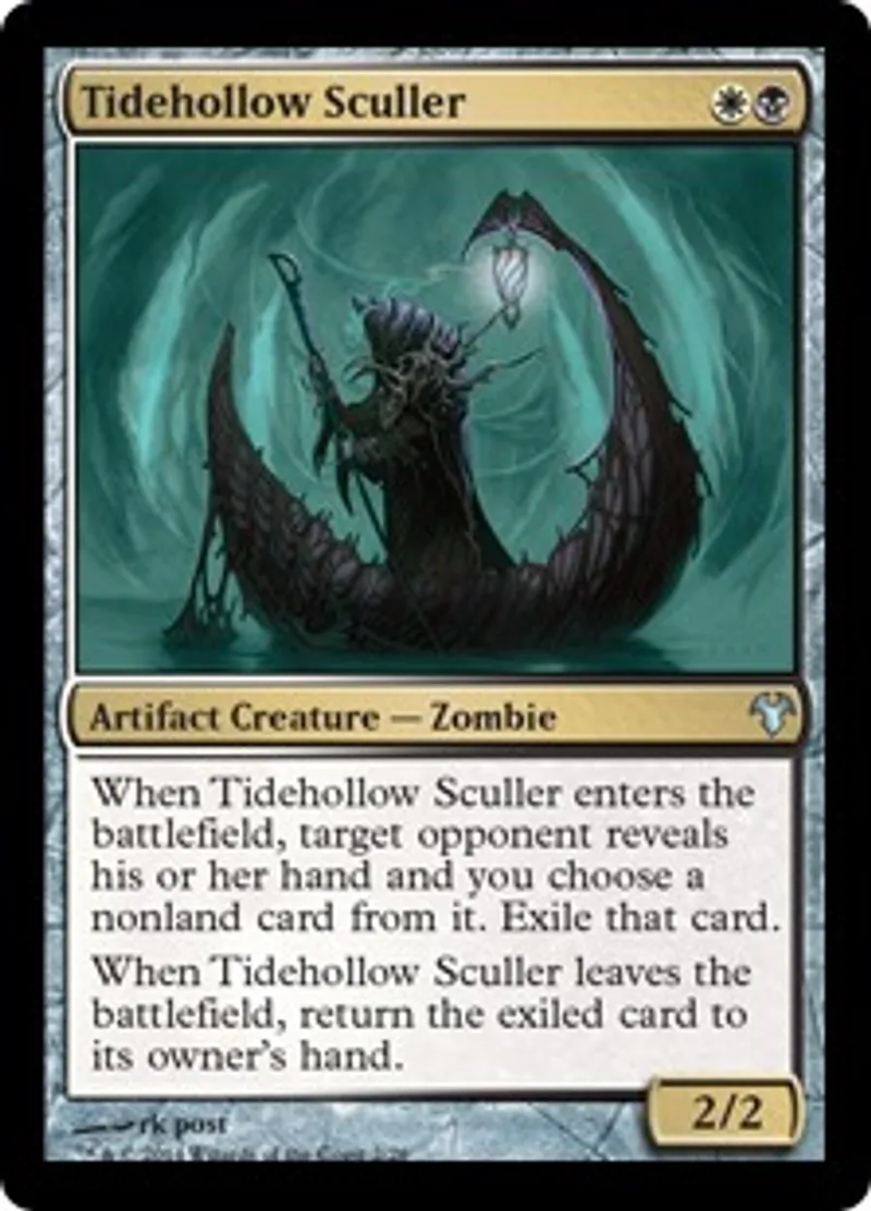 | Oracle Text | When Tidehollow Sculler enters the battlefield, target opponent reveals his or her hand and you choose a nonland card from it. Exile that card. When Tidehollow Sculler leaves the battlefield, return the exiled card to its owner's hand. | ||