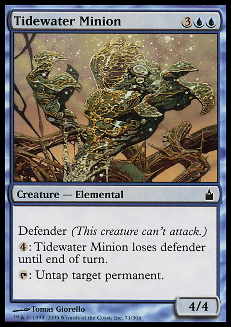 | Oracle Text | Defender (This creature can't attack.) {{4}}: Tidewater Minion loses defender until end of turn. {{t}}: Untap target permanent. | ||