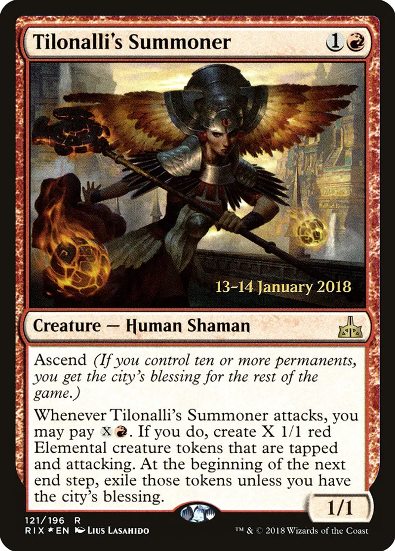 | Oracle Text | Ascend (If you control ten or more permanents, you get the city's blessing for the rest of the game.) Whenever Tilonalli's Summoner attacks, you may pay {{X}}{{R}}. If you do, create X 1/1 red Elemental creature tokens that are tapped and attacking. At the beginning of of the next end step, exile those tokens unless you have the city's blessing. | ||