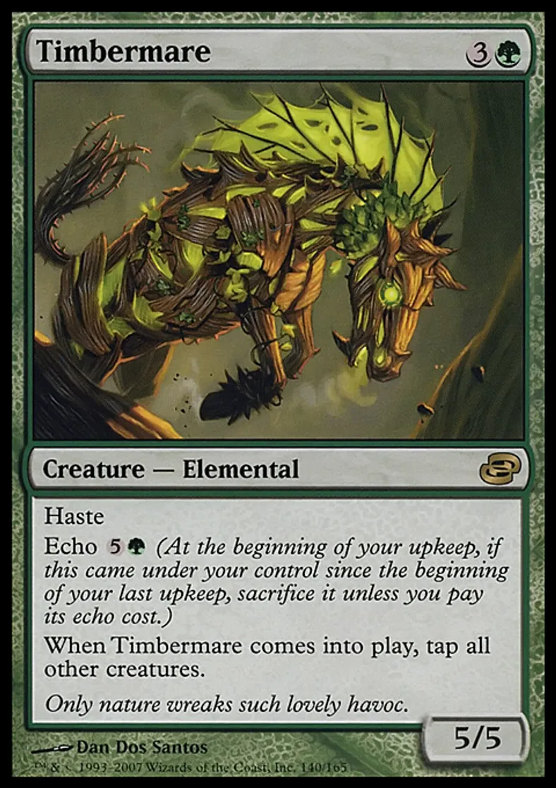 | Oracle Text | Haste Echo {{5}}{{g}} (At the beginning of your upkeep, if this came under your control since the beginning of your last upkeep, sacrifice it unless you pay its echo cost.) When Timbermare enters the battlefield, tap all other creatures. | ||