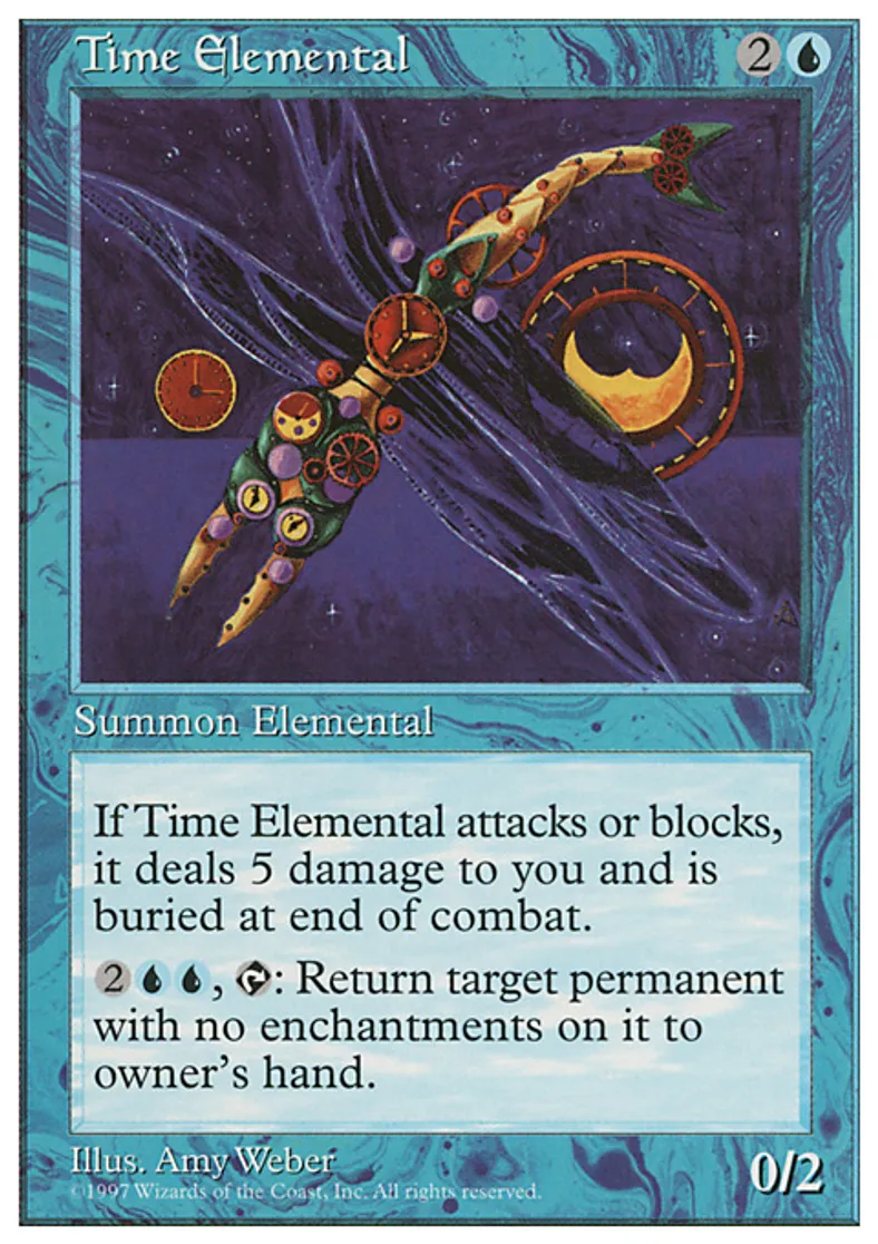 | Oracle Text | When Time Elemental attacks or blocks, at end of combat, sacrifice it and it deals 5 damage to you. {{2}}{{u}}{{u}}, {{t}}: Return target permanent that isn't enchanted to its owner's hand. | ||
