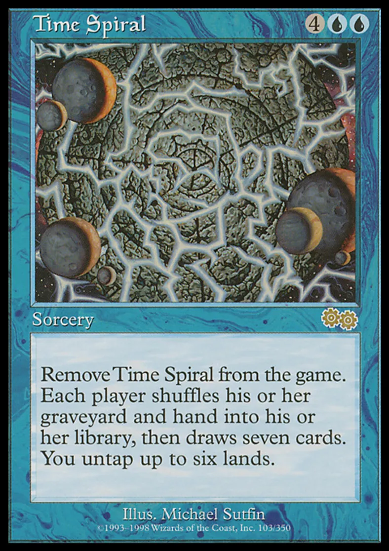 | Oracle Text | Exile Time Spiral. Each player shuffles his or her graveyard and hand into his or her library, then draws seven cards. You untap up to six lands. | ||