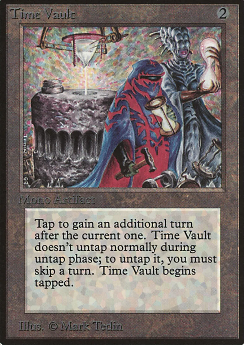 | Oracle Text | Time Vault enters the battlefield tapped. Time Vault doesn't untap during your untap step. If you would begin your turn while Time Vault is tapped, you may skip that turn instead. If you do, untap Time Vault. {{t}}: Take an extra turn after this one. | ||