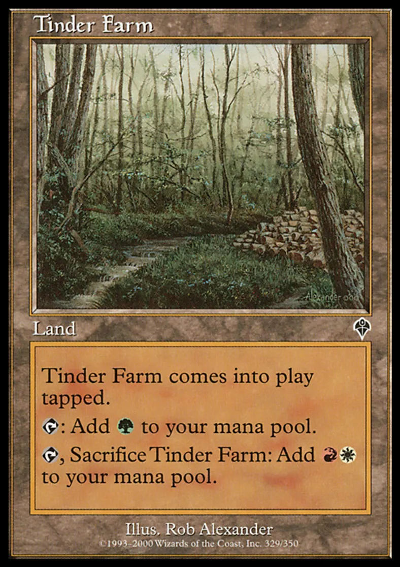 | Oracle Text | Tinder Farm enters the battlefield tapped. {{t}}: Add {{g}} to your mana pool. {{t}}, Sacrifice Tinder Farm: Add {{r}}{{w}} to your mana pool. | ||