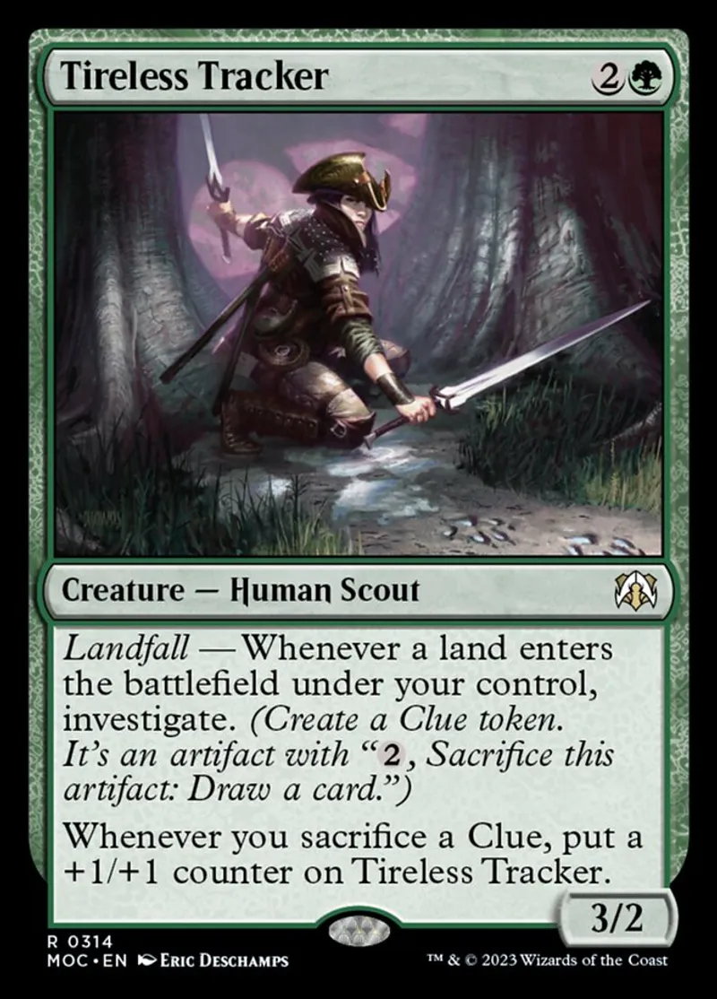 Magic: the Gathering (mtg) rare Creature — Human Scout Tireless Tracker from March of the Machine Commander (moc) last updated 2026-02-21 15:40:02