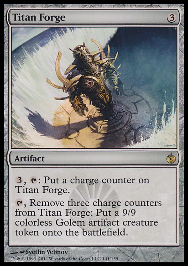 | Oracle Text | {{3}}, {{t}}: Put a charge counter on Titan Forge. {{t}}, Remove three charge counters from Titan Forge: Put a 9/9 colorless Golem artifact creature token onto the battlefield. | ||