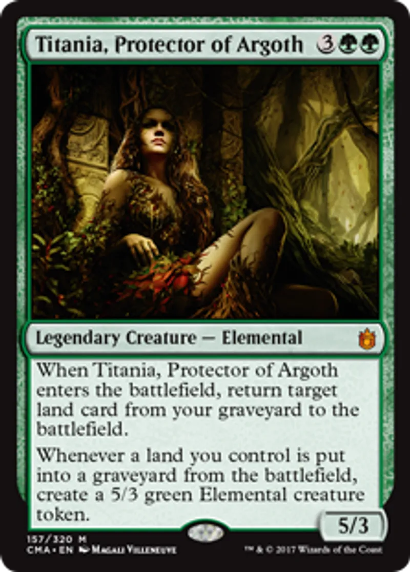 | Oracle Text | When Titania, Protector of Argoth enters the battlefield, return target land card from your graveyard to the battlefield. Whenever a land you control is put into a graveyard from the battlefield, create a 5/3 green Elemental creature token. | ||