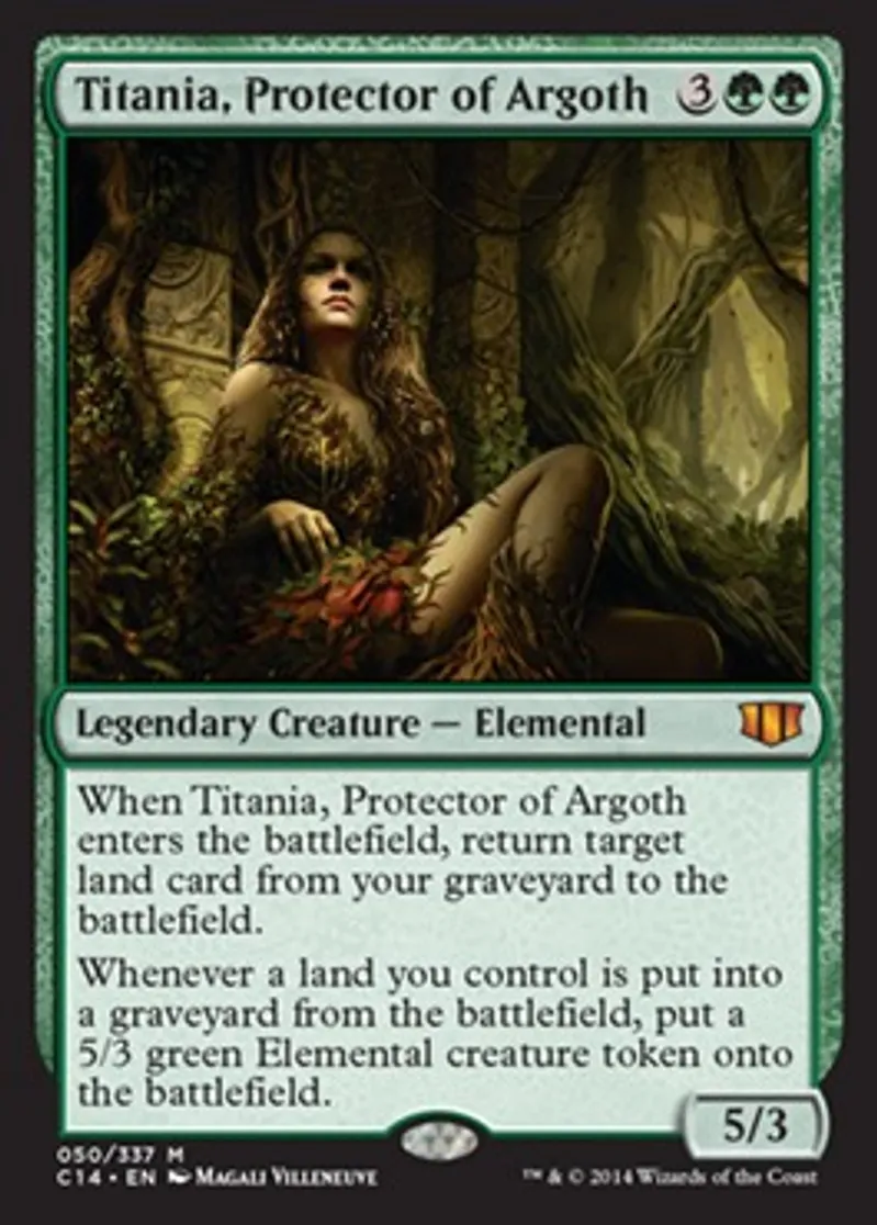 | Oracle Text | When Titania, Protector of Argoth enters the battlefield, return target land card from your graveyard to the battlefield. Whenever a land you control is put into a graveyard from the battlefield, put a 5/3 green Elemental creature token onto the battlefield. | ||