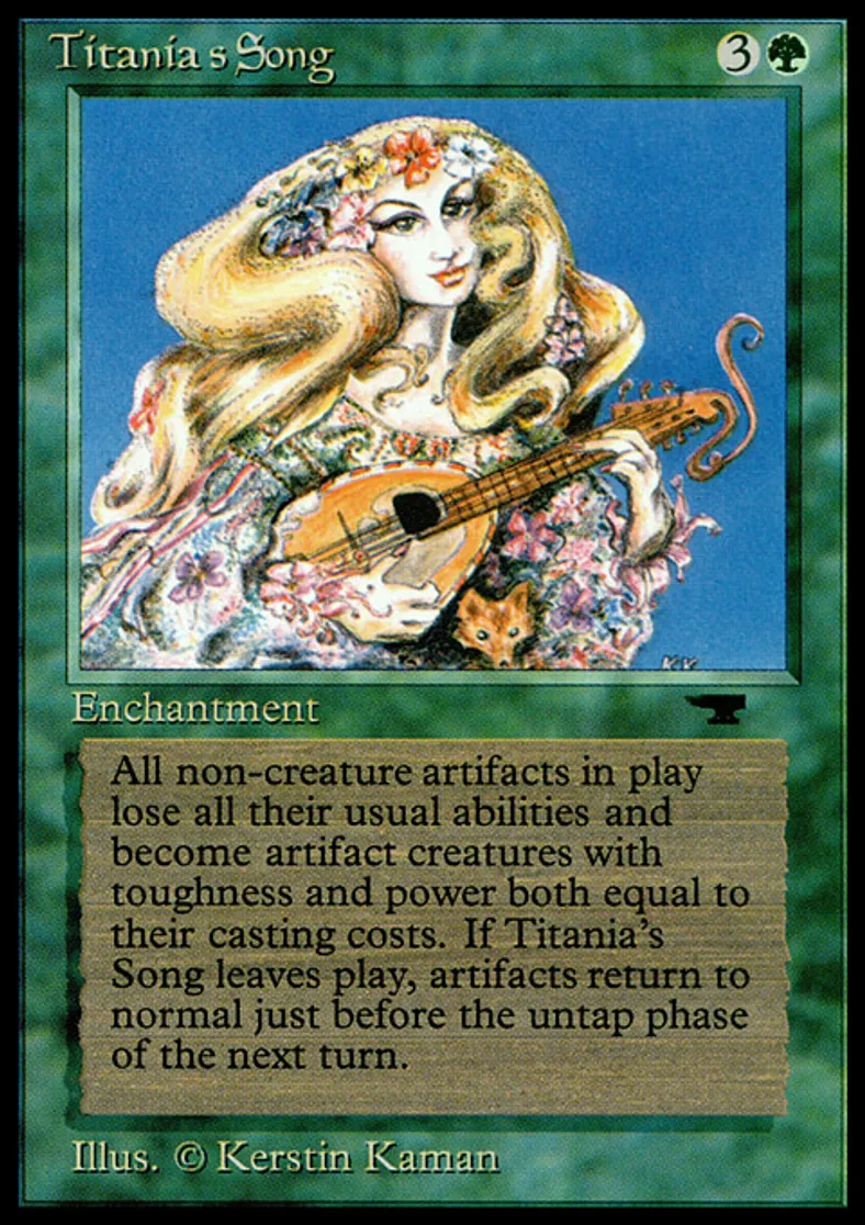 | Oracle Text | Each noncreature artifact loses all abilities and becomes an artifact creature with power and toughness each equal to its converted mana cost. If Titania's Song leaves the battlefield, this effect continues until end of turn. | ||