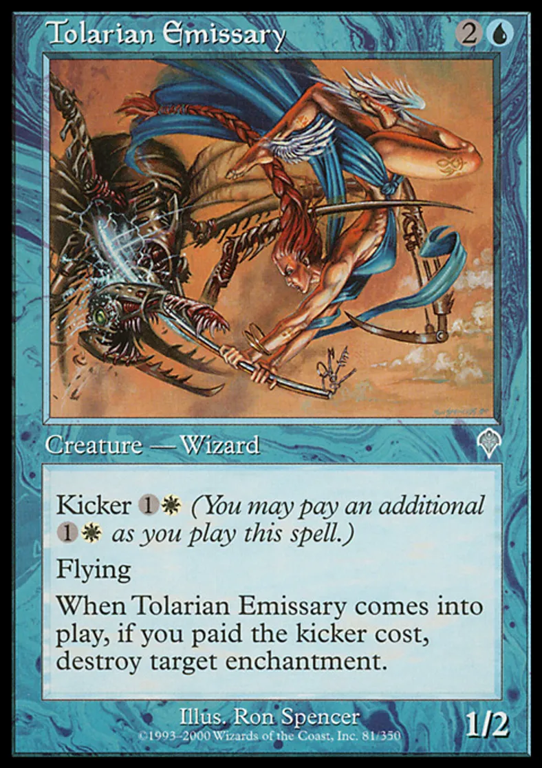 | Oracle Text | Kicker {{1}}{{w}} (You may pay an additional {{1}}{{w}} as you cast this spell.) Flying When Tolarian Emissary enters the battlefield, if it was kicked, destroy target enchantment. | ||