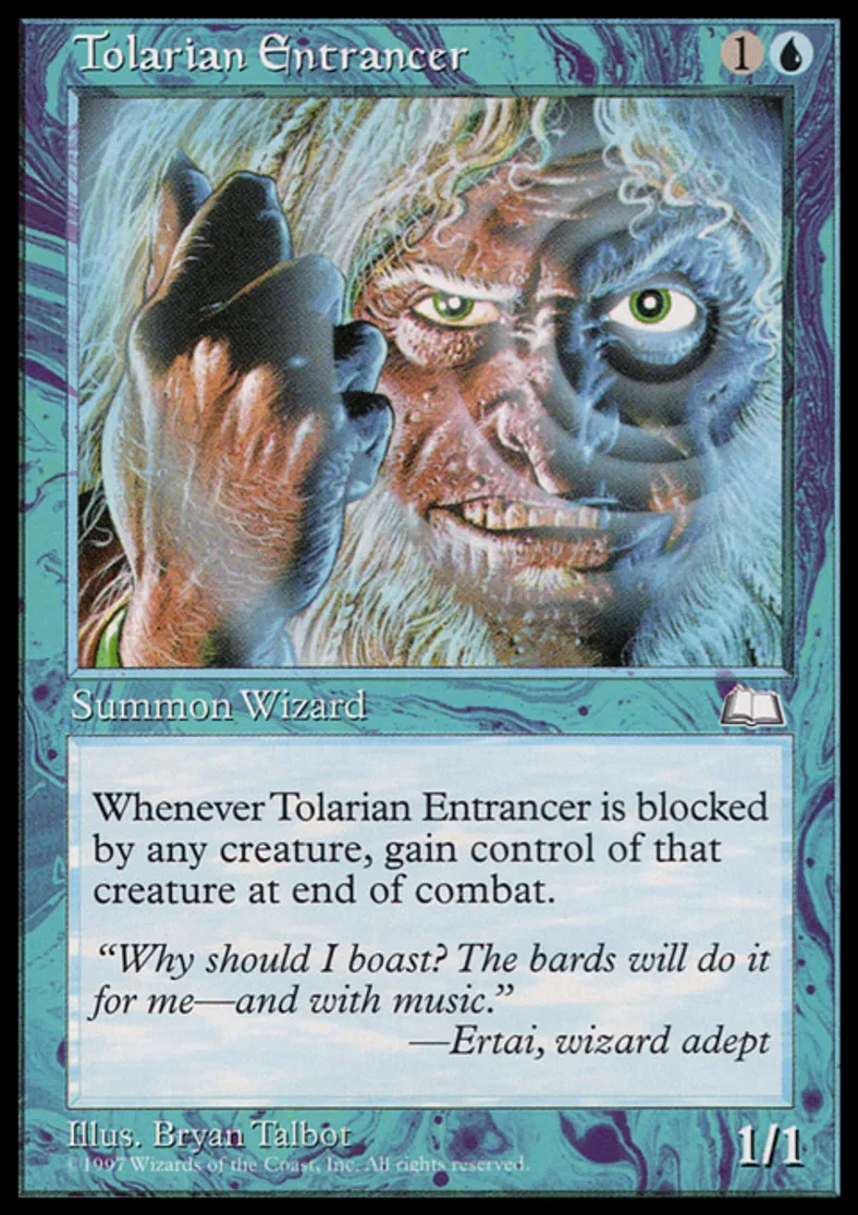 | Oracle Text | Whenever Tolarian Entrancer becomes blocked by a creature, gain control of that creature at end of combat. | ||