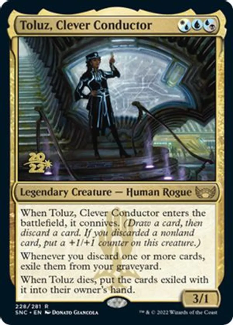 | Oracle Text | When Toluz, Clever Conductor enters the battlefield, it connives. (Draw a card, then discard a card. If you discarded a nonland card, put a +1/+1 counter on this creature.)