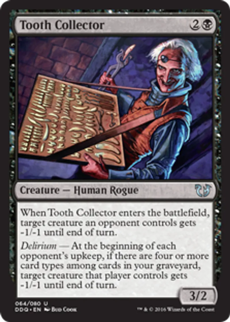 | Oracle Text | When Tooth Collector enters the battlefield, target creature an opponent controls gets -1/-1 until end of turn. Delirium — At the beginning of each opponent's upkeep, if there are four or more card types among cards in your graveyard, target creature that player controls gets -1/-1 until end of turn. | ||