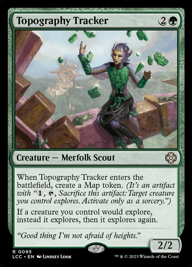 | Oracle Text | When Topography Tracker enters the battlefield, create a Map token. (It's an artifact with "{1}, {T}, Sacrifice this artifact: Target creature you control explores. Activate only as a sorcery.")