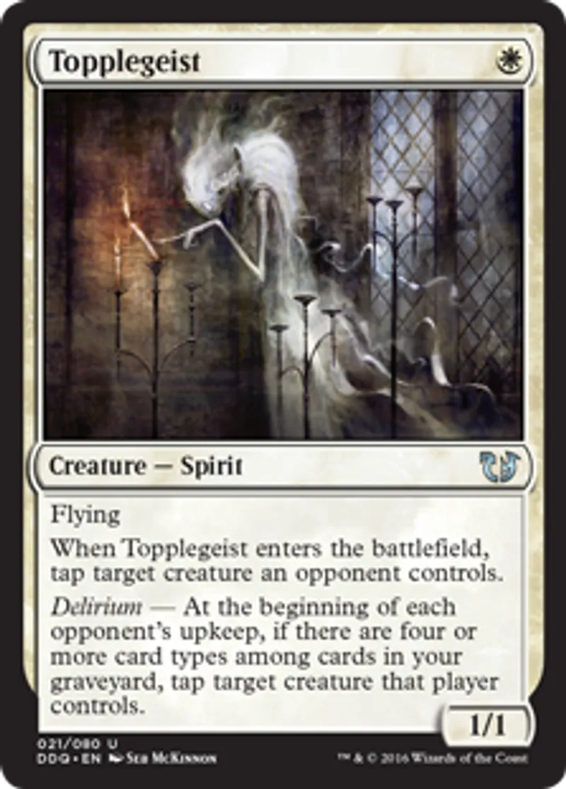 | Oracle Text | Flying When Topplegeist enters the battlefield, tap target creature an opponent controls. Delirium — At the beginning of each opponent's upkeep, if there are four or more card types among cards in your graveyard, tap target creature that player controls. | ||
