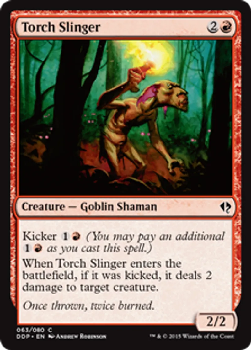 | Oracle Text | Kicker {{1}}{{r}} (You may pay an additional {{1}}{{r}} as you cast this spell.) When Torch Slinger enters the battlefield, if it was kicked, it deals 2 damage to target creature. | ||
