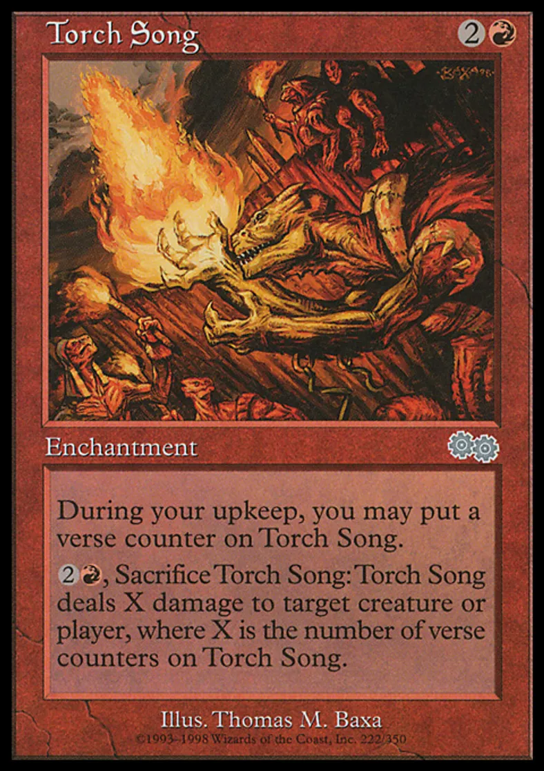 | Oracle Text | At the beginning of your upkeep, you may put a verse counter on Torch Song. {{2}}{{r}}, Sacrifice Torch Song: Torch Song deals X damage to target creature or player, where X is the number of verse counters on Torch Song. | ||