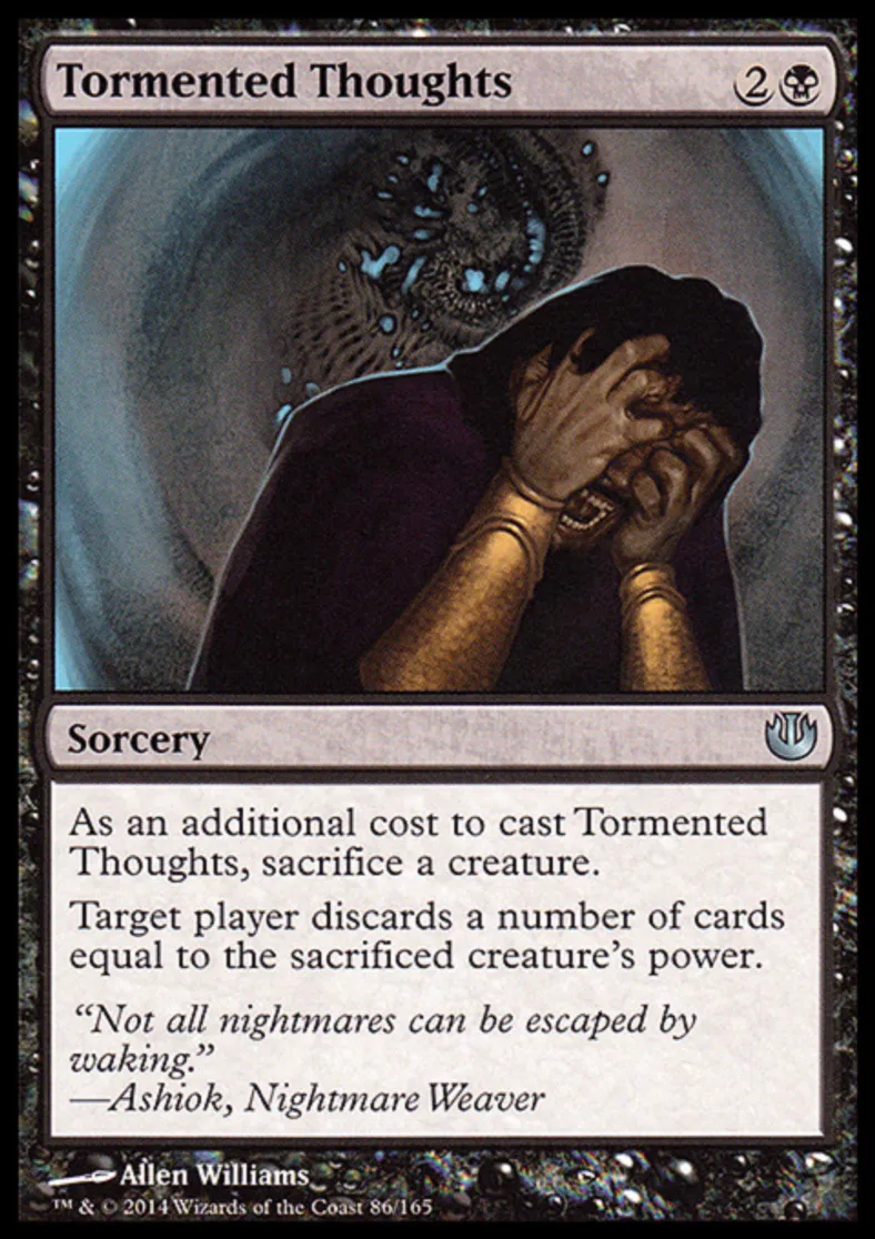 | Oracle Text | As an additional cost to cast Tormented Thoughts, sacrifice a creature. Target player discards a number of cards equal to the sacrificed creature's power. | ||