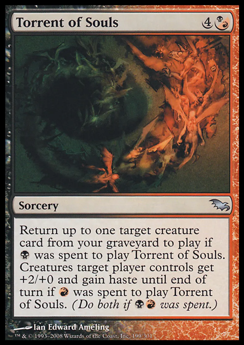 | Oracle Text | Return up to one target creature card from your graveyard to the battlefield if {{b}} was spent to cast Torrent of Souls. Creatures target player controls get +2/+0 and gain haste until end of turn if {{r}} was spent to cast Torrent of Souls. (Do both if {{b}}{{r}} was spent.) | ||