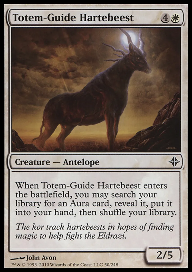 | Oracle Text | When Totem-Guide Hartebeest enters the battlefield, you may search your library for an Aura card, reveal it, put it into your hand, then shuffle your library. | ||
