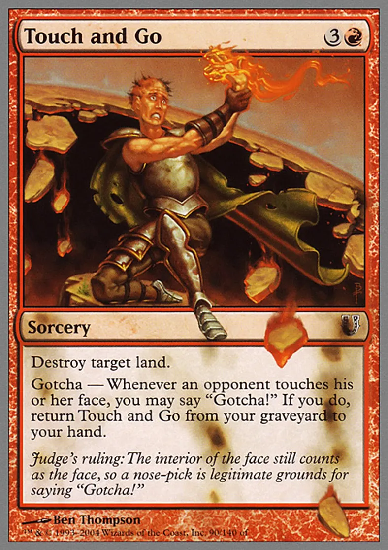 | Oracle Text | Destroy target land. Gotcha Whenever an opponent touches his or her face, you may say "Gotcha" If you do, return Touch and Go from your graveyard to your hand. | ||