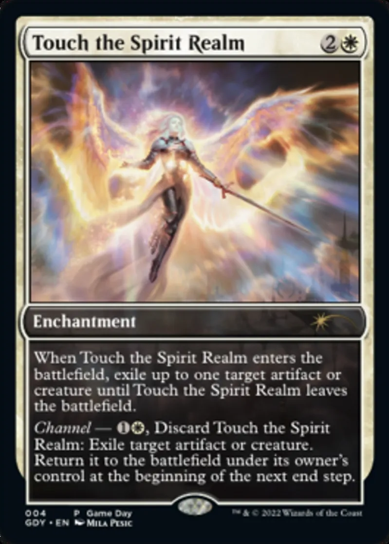 Channel — {{1}}{{w}}, Discard Touch the Spirit Realm: Exile target artifact or creature. Return it to the battlefield under its owner's control at the beginning of the next end step. | ||