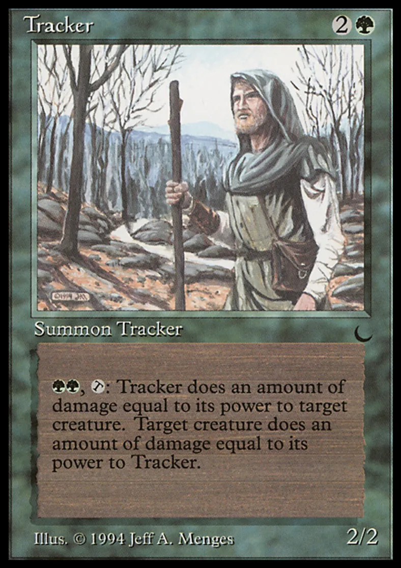| Oracle Text | {{g}}{{g}}, {{t}}: Tracker deals damage equal to its power to target creature. That creature deals damage equal to its power to Tracker. | ||